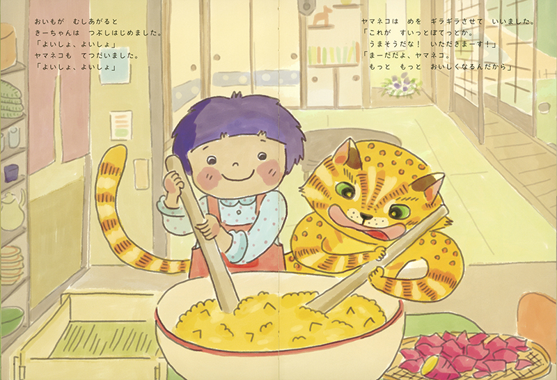 女の子とヤマネコが、一緒にスイートポテトを作ります。食いしんぼうなヤマネコは、出来上がりが待ちきれません。スイートポテトを「すいっとぽてっと」と聞き間違えて、「すいっとぽてっとの歌」を歌って踊って、いまかいまかと待ちわびます。