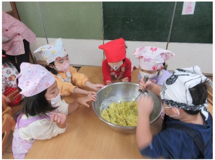 子どもたちと一緒に考えたすいっとぽてっとの歌をうたったり、クッキング活動