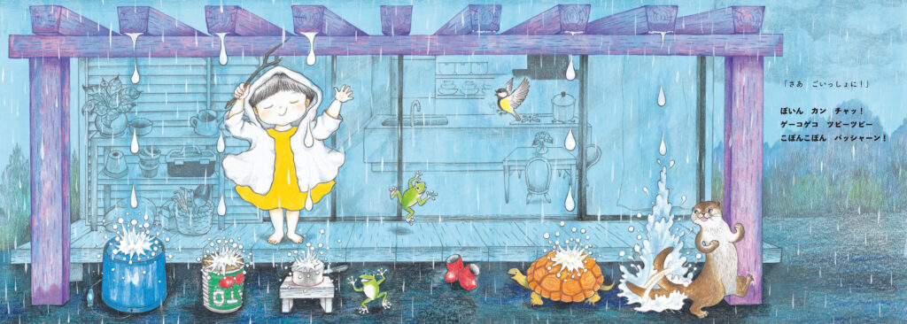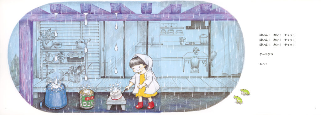 雨の日がつづき退屈していた女の子“うたちゃん”は庭へ出ます。転がっていたバケツをひろうと「ぽいん!」。バケツの底に雨粒が当たって音が鳴りました。隣に空き缶を並べると「ぽいん! カン!」。さらに、おなべを並べると「ぽいん! カン! チャッ!」。楽しい音が鳴り響きます。カエルやカメも仲間入りしてはじまるのは、雨の日の演奏会。声に出して楽しい、雨の日の物語です。