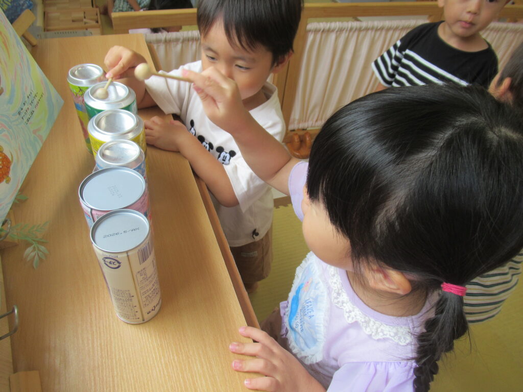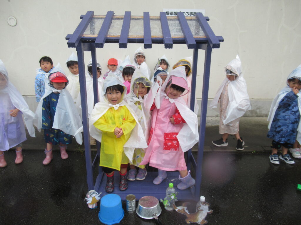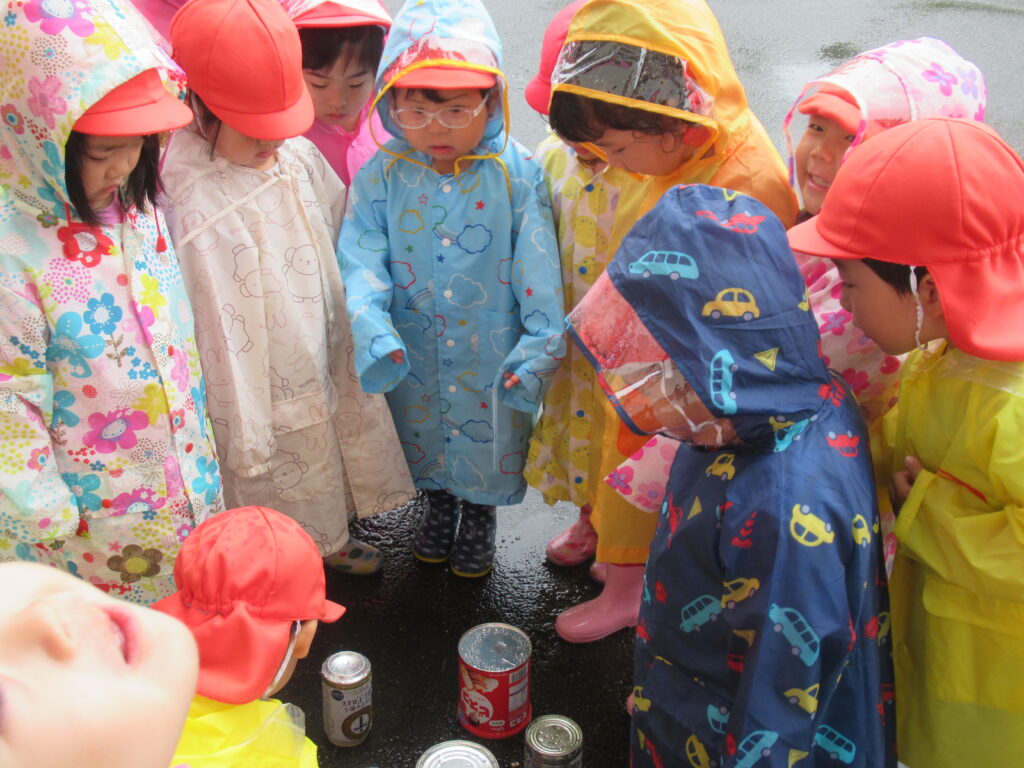 レインコートを着て、雨の日ならではの遊びや生き物との出会いも沢山楽しみました。バケツや缶を出してみると雨粒があたり、楽しい音が響き渡ると「絵本と一緒だ!」と喜ぶ子どもたち。