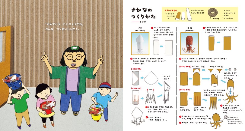 魚釣りの工作遊びは古くからありますが、クリップで引っかける、マグネットでくっつけるなど、簡単過ぎるものはすぐに飽きてしまいます。それは発見する喜び、工夫する楽しさがないからです。本書ではトイレットペーパーの芯を使って、タコやウナギなど、様々な形状の魚を紙工作して、さらに釣り具も作ります。釣り方は本物と同じで魚の口や身体に釣り針を引っかけますが、釣り針の形や大きさは、それぞれ釣り上げる魚に合わせて工夫する必要があります。易しいものも難しいものもあります。自分自身にちょうど良いくらいの難易度を模索して、魚釣り遊びをしてみましょう。紙工作の面白さと釣り上げる愉快さの詰まった一冊です。