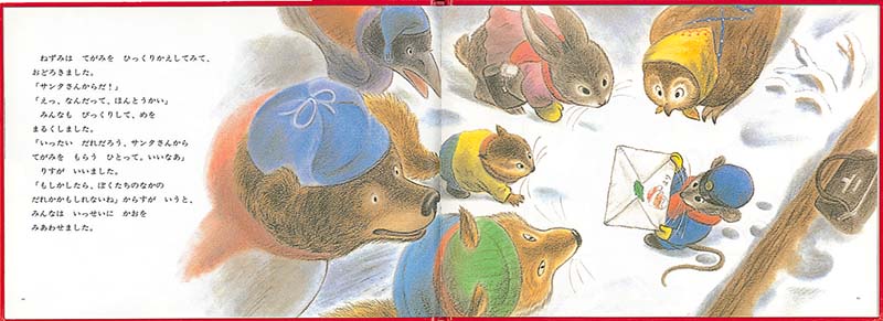 クリスマスの前の日、ネズミの郵便屋さんは鞄に手紙を詰めこんで配達に出かけましたが、雪にすべって転んでしまいました。あわてて手紙を拾い集めましたが、最後の1通の宛名が雪で濡れてわからなくなっていました。困っていると、森の動物の仲間たちがいっしょに考えてくれて、ついにわかりました。その手紙は、サンタさんからネズミの郵便屋さんへの手紙だったのです……。