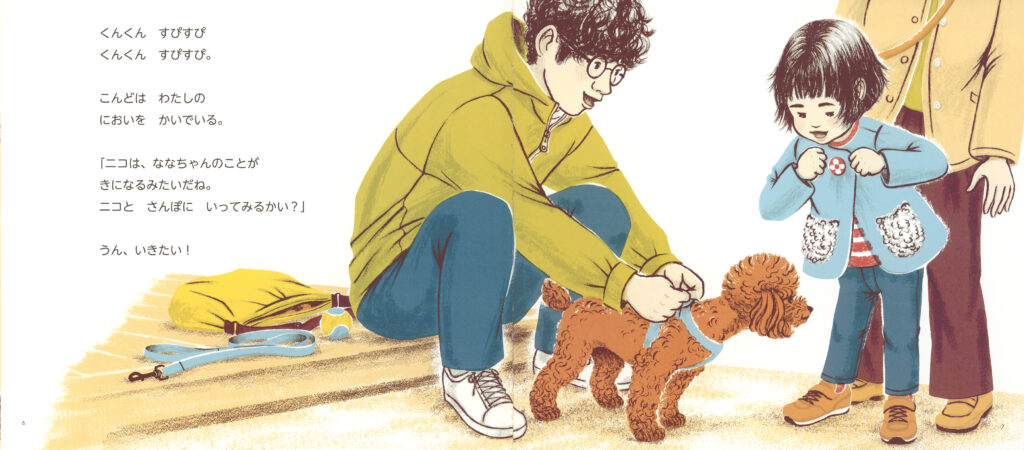 犬のニコはいつでもどこでも“くんくん すぴすぴ”とにおいを嗅ぎます。その姿を見守りながら散歩する主人公の女の子。あれ、わたしのにおいを嗅いでるよ! どうしたのかな?