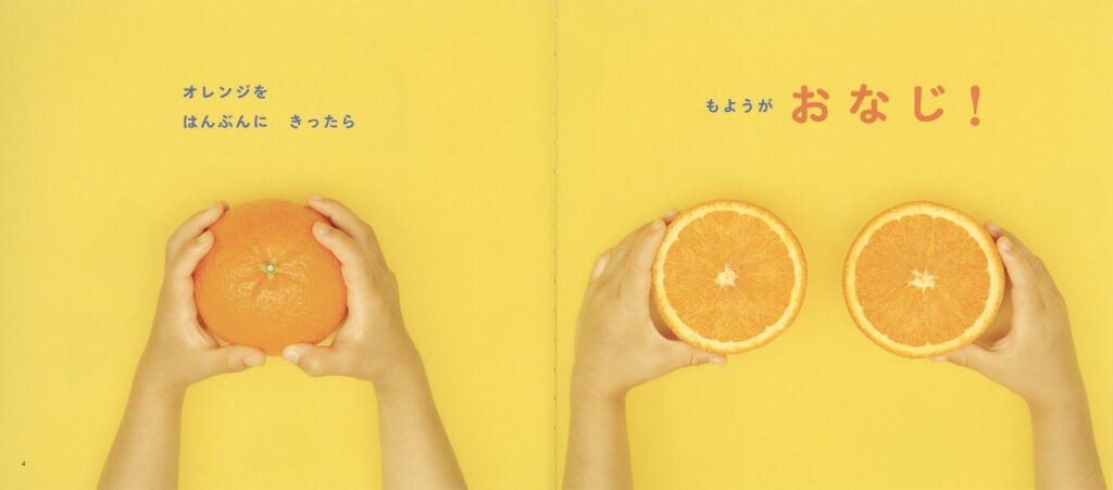 オレンジを真ん中で切ると、右も左もおなじ模様!
