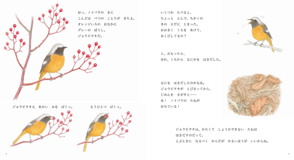 ノイバラの実を食べるジョウビタキを見ていたときのこと、近くの木の枝に飛び移って口をあけたと思ったら、ぺっとタネをはきだしました。「わあ!」と心のなかで歓声をあげ、ジョウビタキが飛び去ったあと、画家の江口あけみさんと3人で鳥のいた枝の下をはいつくばり……はきだされた小さなタネをゲット! まぎれもなくノイバラのタネで、3人で感激しました。