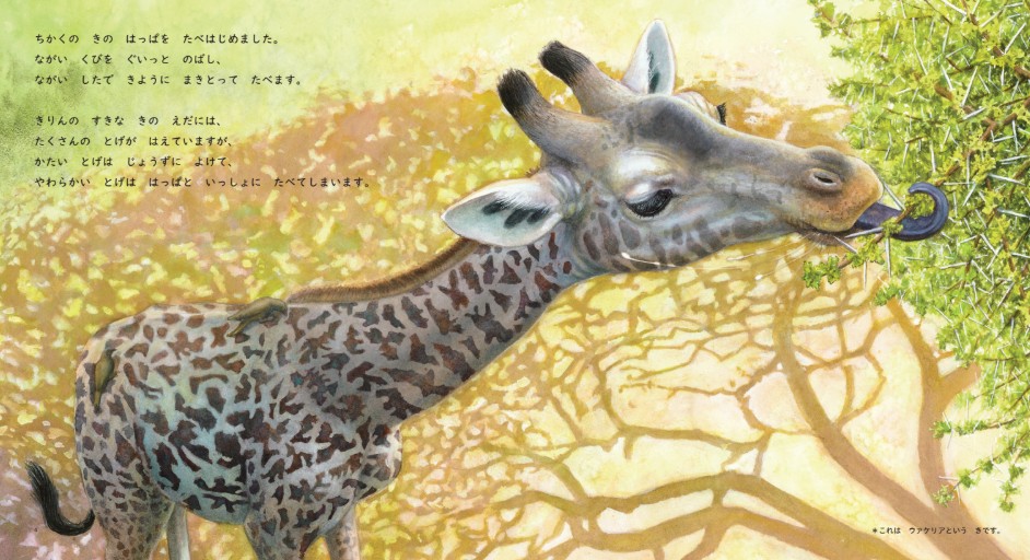 みなさんがこの絵本を手に取っている今、この瞬間も、絵本に描かれているキリンやその子どもたちが、遠くアフリカの草原で、林のなかで、ゆったりと歩いたり、木の上の葉っぱを食べたりしていることでしょう。