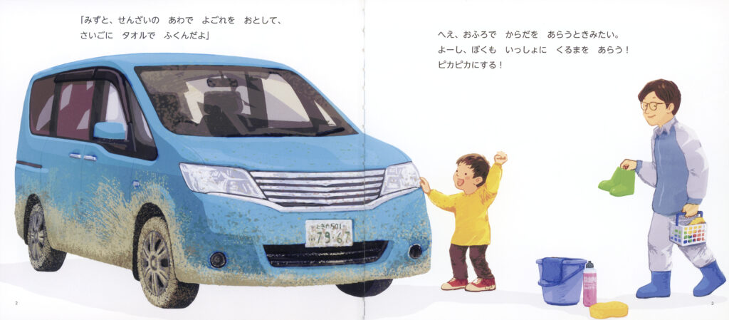 手がけるのは斉藤俊行さん。『クリスマスの ふしぎな はこ』(福音館書店)をはじめ、たくさんの絵本の絵を描いてきた斉藤さんですが、文章と絵をともに手掛けるのは初めてです。そんなに今作に登場する車は、斉藤さんの愛車がモデル。その愛車を編集者とともに洗いながら、車の大きさから細部のつくりにまで一緒に「驚いた」成果が、この絵本には詰まっています。