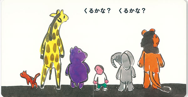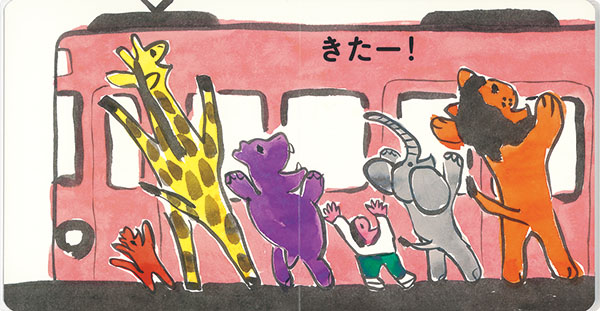 「くるかな? くるかな?」動物たちが電車を待っていると、「きたー!」ホームに滑りこんできた電車にみんな大喜び。動物たちは「くるかな? また くるかな?」と次の電車を待ちます。