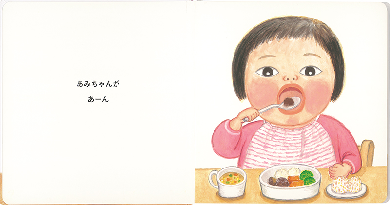 「もぐもぐ がじがじ」という擬音にあわせて、ごはんを勢いよく食べる子どもたちを描きます。食べることが大好きになる一冊です。