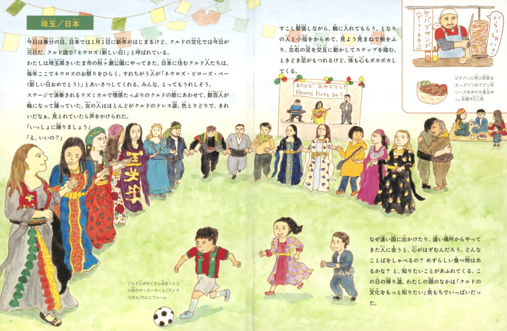 この本では、ネウロズと美しいドレスを中心に、クルドの文化を紹介します。日本だけではなく、イランのマリーヴァーン、イラクのスライマーニーヤ、カナダのカルガリー、オーストラリアのブリスベンとアデレード、イギリスのウルヴァーハンプトンとロンドンとリヴァプール、ドイツのミュンヘンとフランクフルト、いろんな場所に住むクルドの人たちを取材して作りました。あの美しいドレスには、どんな思い入れがあるのか? ネウロズがどれほど大切にされていて、踊りと音楽がどれほど愛されているか? また世界各地に住むクルドの人たちが日常生活でどんなことを楽しみにしているか? 美味しそうなクルド料理もたくさん登場します。そして、どこの国にいても、どんな境遇にあっても、クルドの人たちが私たちと同じように、日々を幸せに生きようとする姿を金井真紀さんがのんびりとあたたかく描いています。