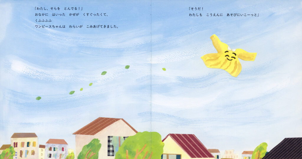 すると、風が吹いてきて、空に舞い上がりました。「わたしも こうえんに あそびに いこーっと」。