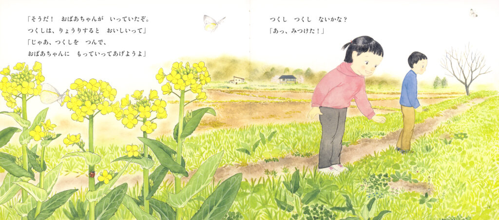 幼い子がつくしと出会った時にどんな楽しみ方ができるかを、広野さんはつくしを摘みながらたくさん考えて、物語に詰め込んでくださいました。