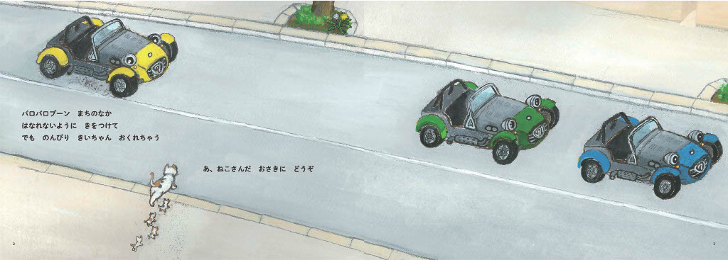 このスーパーセブンという車の魅力を中心に絵本ができないかというところから出発して、いつしか、仲良しの友だちと一緒に出かけるうれしさ、一緒にいられる喜びを祝福するようなおはなしができあがっていきました。それは、街中で時折見かける、園児のみなさんが隣の友だちと手をつないで楽しそうにお散歩する様子にも重なるようでした。