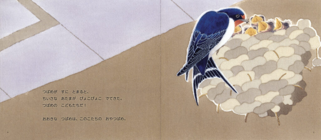 手がけるのは、布に染料を使って描く“手染め絵”の技法で、多くの絵本を制作されてきた山口てつじさんです。幼い頃、近所でツバメの子育てを見守るのが毎年の楽しみだったという山口さん。ツバメの魅力を詰め込んだ絵本を作ろうと、お住まいの大阪で2年にわたり観察を重ねてくださいました。担当編集者は山口さんとの取材時、カラスに壊されたツバメの巣をいくつも目にしました。自然界の厳しさを知るほどに、無事に育ったヒナたちの「ぎゅうぎゅう」ぶりが愛おしく感じられます。
